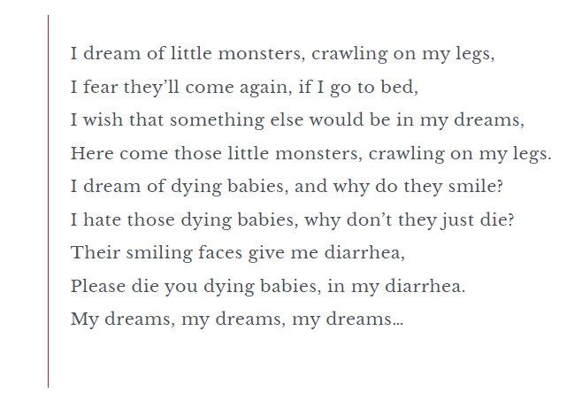 'Composer, can we let a sunk-sounding woman sing these lines, bit of bossa-nova combined with cool jazz... And then concluding the song, she sings, and it should sound loud and clear, 'dying IN my diahrrea'. Can you record that? Would be ace, my friend, ty.'